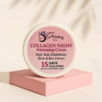 Collagen Herbal Night Whitening Cream (20g) is your night skin therapy designed to restore glow while you sleep. A mixture of three powerful whitening and brightening ingredients — Kojic Acid, Glycolic Acid, and Glutathione — helps lighten dark spots, even out skin tone, and reduce dullness. Made with a gentle base of shea butter, beeswax, and herbal extracts, it deeply nourishes without feeling heavy. With rice alum for added skin clarity, this cream works overnight as a targeted treatment — giving your skin the break it deserves and leaving it visibly brighter, smoother, and healthier by morning. Use consistently for 15 days and see visible improvement in your skin’s texture, clarity, and glow.