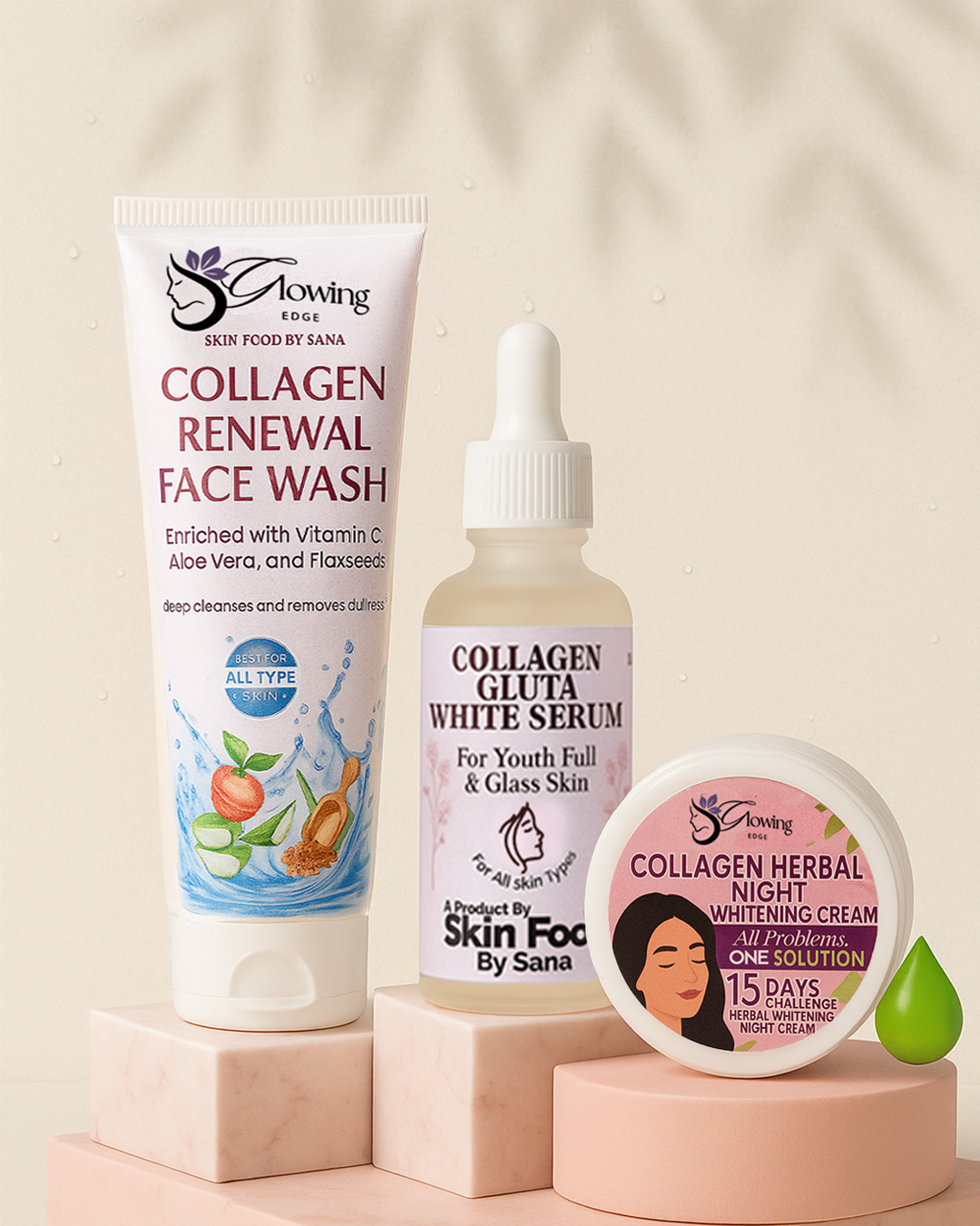 This bundle is for anyone looking to brighten their skin tone and improve texture without complicating their routine. Start with our Collagen Renewal Face Wash to cleanse and prep your skin. Follow it up at night with the Collagen Herbal Night Whitening Cream, designed to deeply hydrate and repair while you sleep. For an added glow and visible brightening, use the Gluta White Serum regularly—it’s lightweight but powerful.